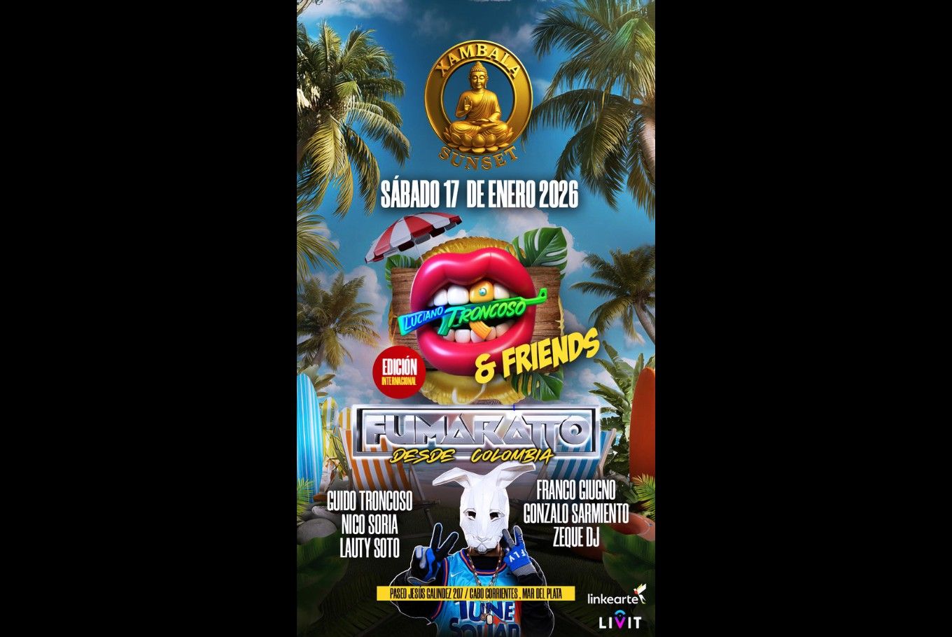El mejor SUNSET del verano regresa con LUCIANO TRONCOSO & Friends en su 5ª Temporada Internacional. Desde Colombia, FUMARATTO EN VIVO hará vibrar a Mar del Plata. DJs como GUIDO TRONCOSO, NICO SORIA, y más ofrecerán una experiencia única. Camastros para 10 personas disponibles con consumo incluido. Evento exclusivo para mayores de 18 años. ¡Vivi la experiencia XAMBALA!