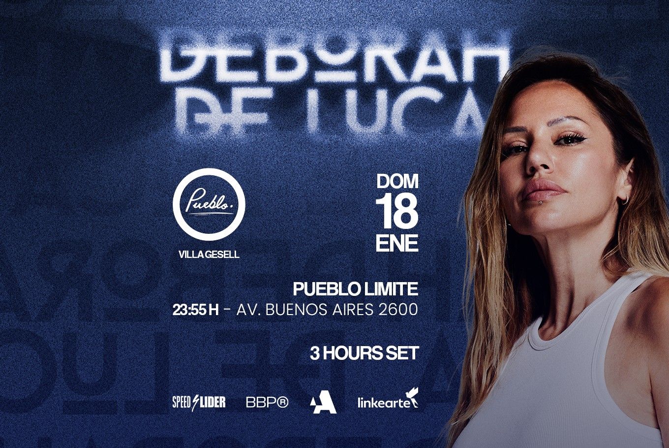 La reina del techno, Deborah De Luca, regresa a Argentina para una noche inolvidable de música electrónica. Disfruta de un set extendido de 3 horas en el escenario de Pueblo Límite, Villa Gesell. Ingreso mayores de 18 años.