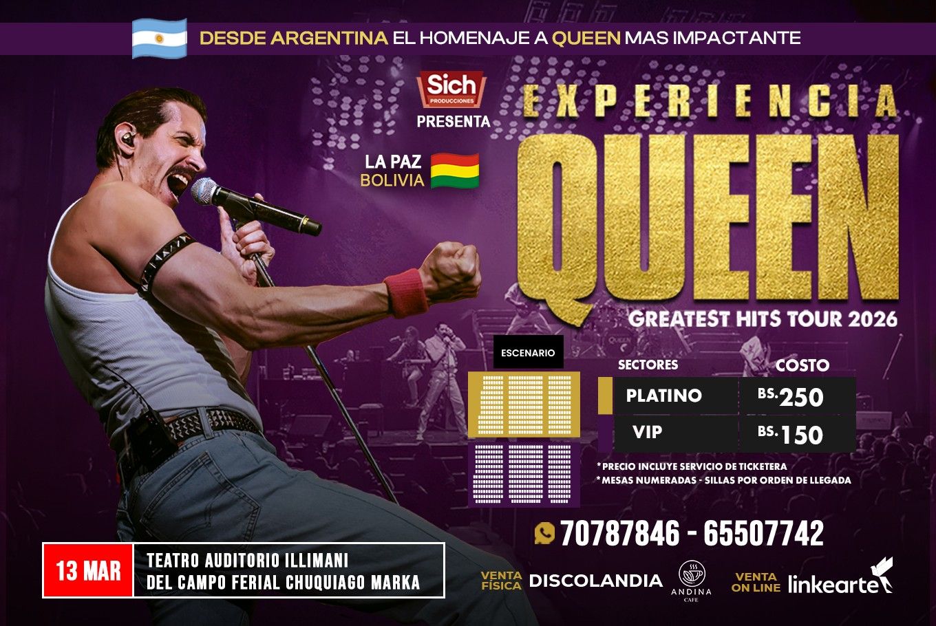 El 13 de marzo, el TEATRO AUDITORIO ILLIMANI presenta 'Experiencia Queen - Greatest Hits Tour 2026', un concierto que revive los icónicos momentos de la banda. Con vestuarios auténticos y instrumentos originales, este show promete una experiencia inolvidable para los amantes del rock. No te lo pierdas en La Paz.